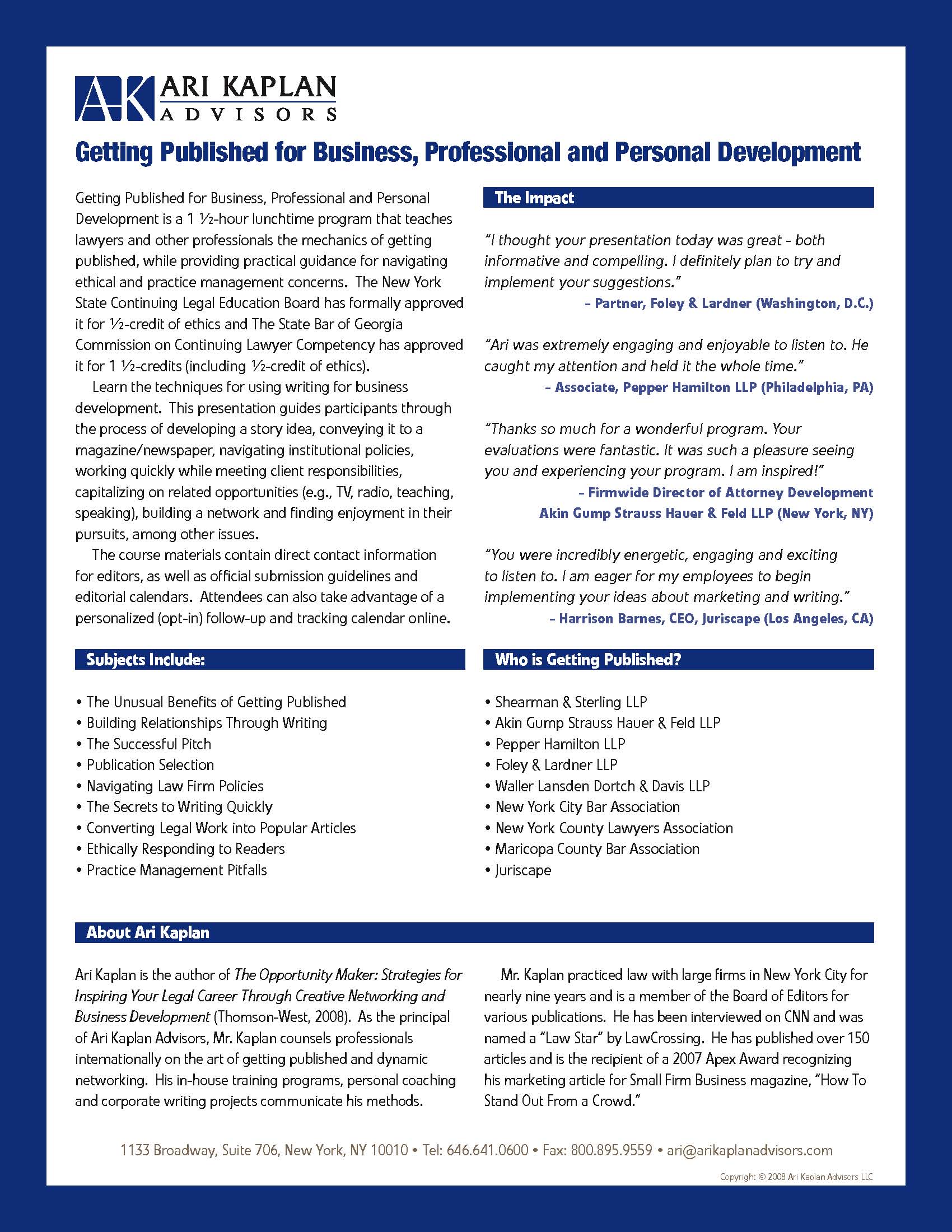 "Ari Kaplan and I served on a panel to teach attorneys about the power of media relations. Ari's presentation on writing bylined articles was superb and I highly recommend him to law firms interested in learning more about how to write articles effectively."
